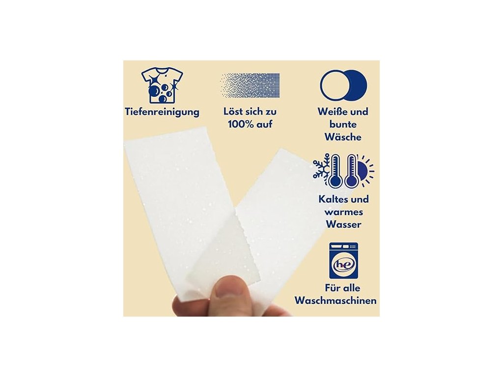 Praktické a prostorově úsporné: předdávkované prací proužky - žádné rozlití, žádné měření není nutné. Kompaktní balení šetří místo v domácnosti i na cestách.